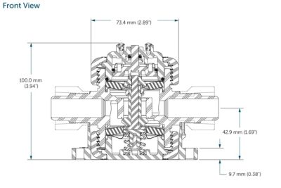 | Pressure range: | 29" Hg vacuum to 120 psig (980 mbar to 827.3 kPa) inlet and outlet at 73°F (23°C) 29" Hg vacuum to 60 psig (980 mbar to 414 kPa) inlet and outlet at 230°F (110°C) |