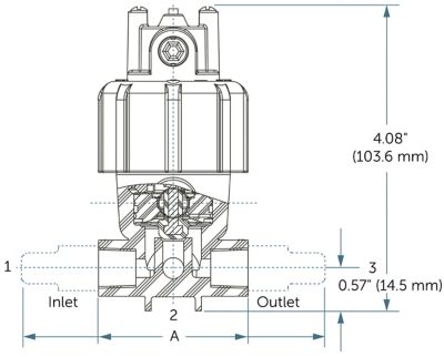 | ポート接続 | ポート1からポート3 への流量係数 Cv (Kv) | ポート1または3からポート2 への流量係数 Cv (Kv) | A寸法 |