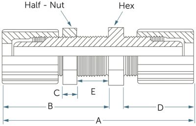 | 型番 | 接続1と接続2 | オリフィス | 寸法 | 六角対辺 | ハーフナット | パネル取り付け穴直径 | ハーフナット型番 | ||||